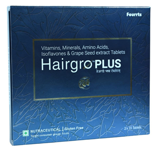 Hairgro Plus Tablet is a hair care supplement formulated with Vitamins, Minerals, Amino Acids, and Grape Seed Extract and 34 essential nutrients that support hair growth and scalp health.